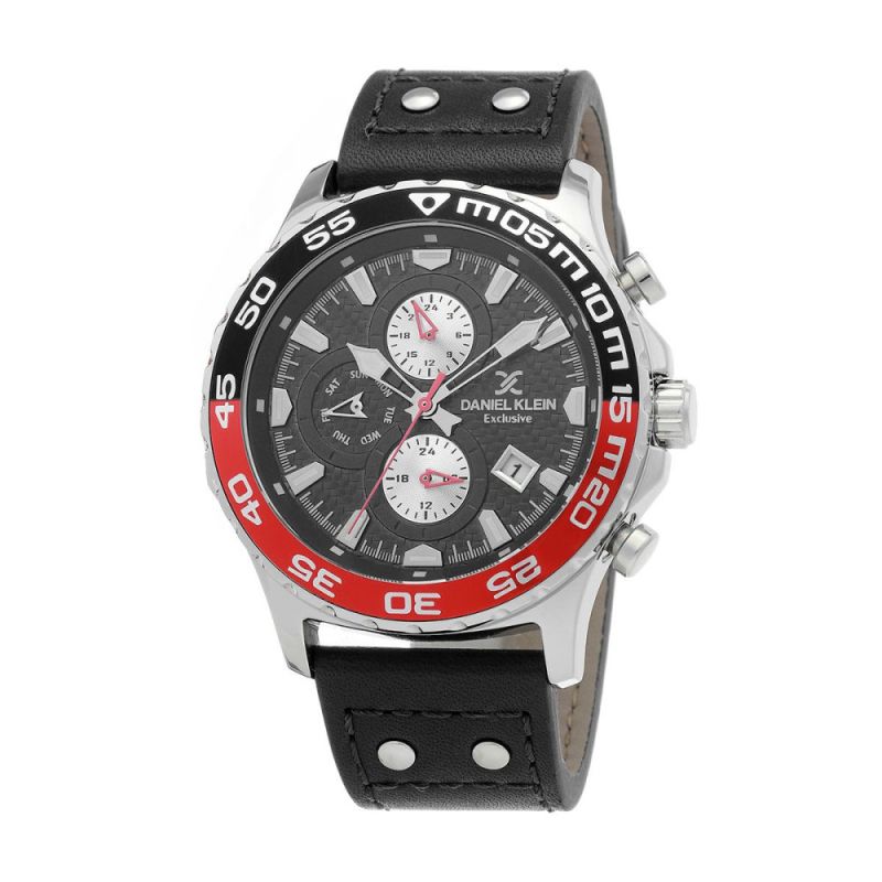 Спортно-елегантен мъжки часовник Daniel Klein с мултифункционален дисплей. Стъкло минерал-кристал. Корпус от висококачествена метална сплав. Черна кожена каишка с нитове. Кварцов механизъм. Водоустойчивост 5 ATM - допускат се леки пръски и взимане на душ, не се препоръчва обилно мокрене.
