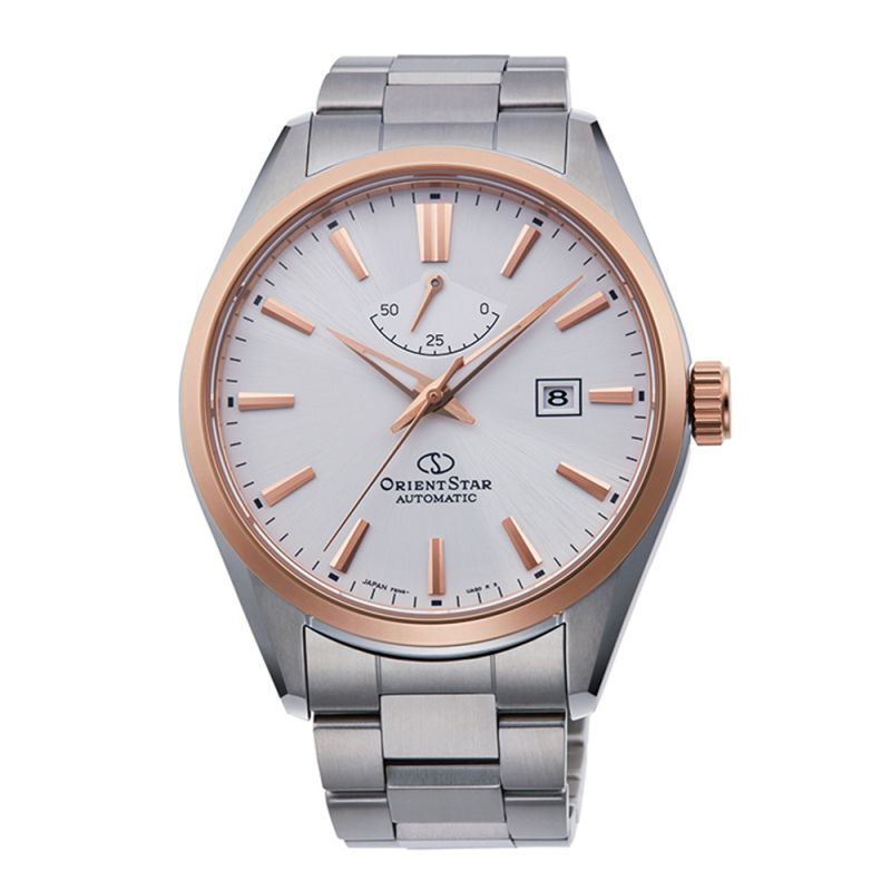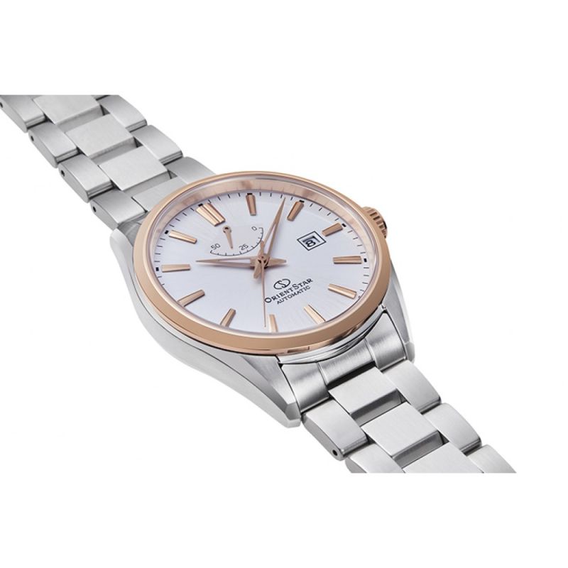 Класически модел мъжки часовник Orient Star. Корпус и верижка от неръждаема стомана. Бял аналогов дисплей с показател за дата и индикатор за резервната мощност. Сапфирено стъкло с антрирефлексно покритие. Автоматичен механизъм с резервна мощност 50 часа. Водоустойчивост 5 ATM - допускат се леки пръски и взимане на душ, не се препоръчва обилно мокрене.