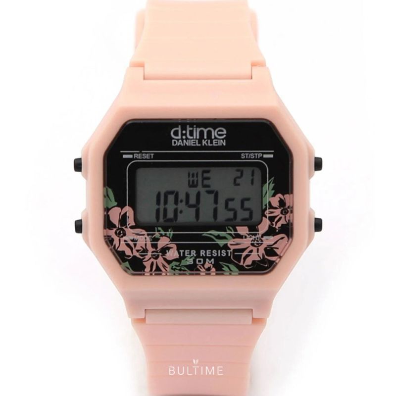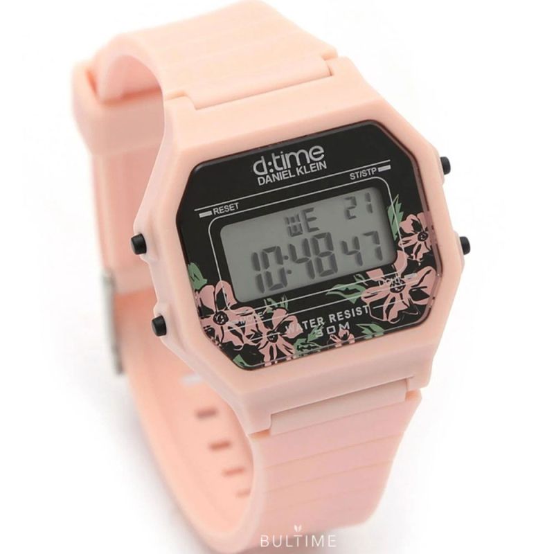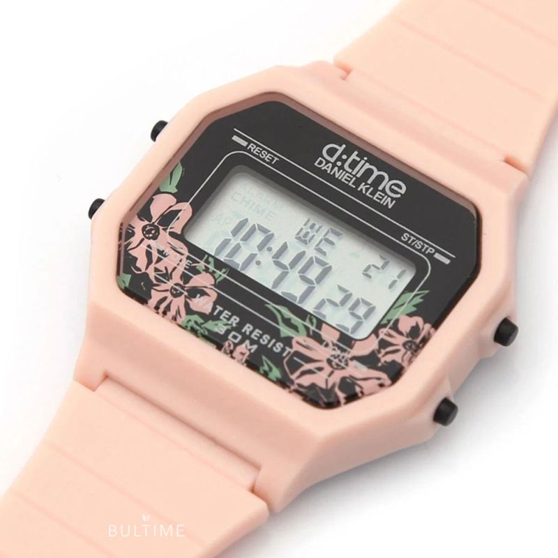Спортен модел дамски часовник Daniel Klein от колекцията D Time. Часовникът е с корпус от полимер и силиконова каишка. Дигитален дисплей с плексигласово стъкло. Моделът има следните функции: показател за дата и ден от седмицата, 12/24 часов формат, второ време, хронограф, аларма и осветяване на дисплея. Задвижва се от кварцов механизъм. Водоустойчивост 3 ATM - допускат се леки пръски, не се препоръчва обилно мокрене.