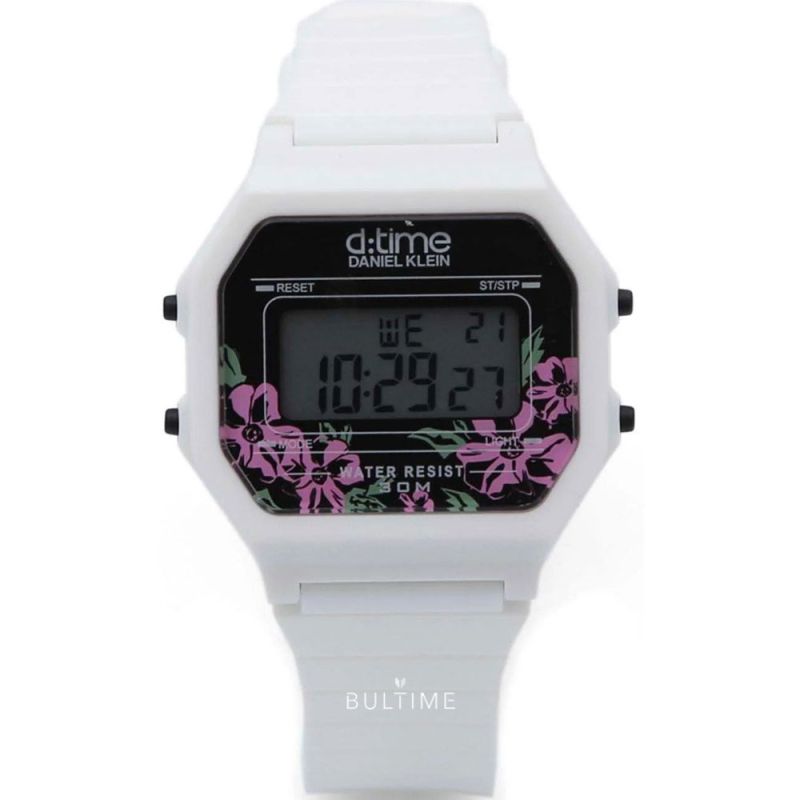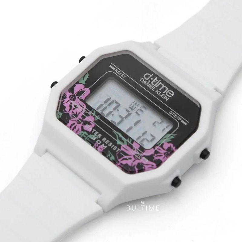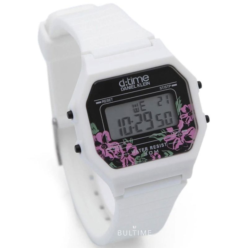 Спортен модел дамски часовник Daniel Klein от колекцията D Time. Часовникът е с корпус от полимер и силиконова каишка. Дигитален дисплей с плексигласово стъкло.  Моделът има следните функции: показател за дата и ден от седмицата, 12/24 часов формат, второ време, хронограф, аларма и осветяване на дисплея. Задвижва се от кварцов механизъм. Водоустойчивост 3 ATM - допускат се леки пръски, не се препоръчва обилно мокрене.