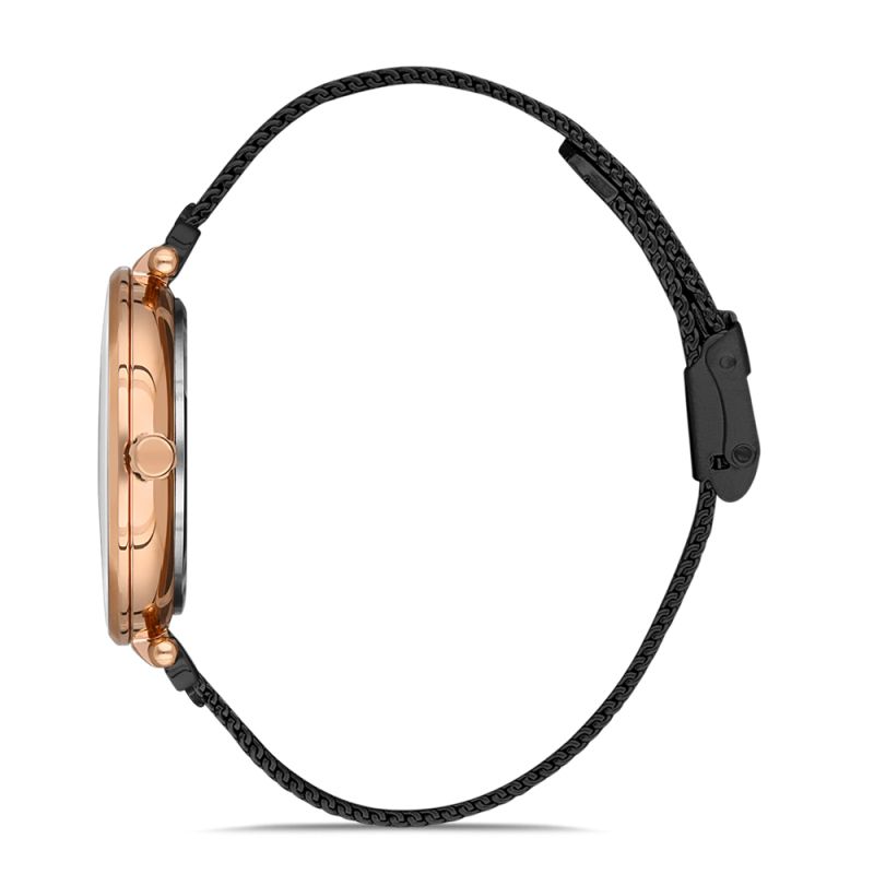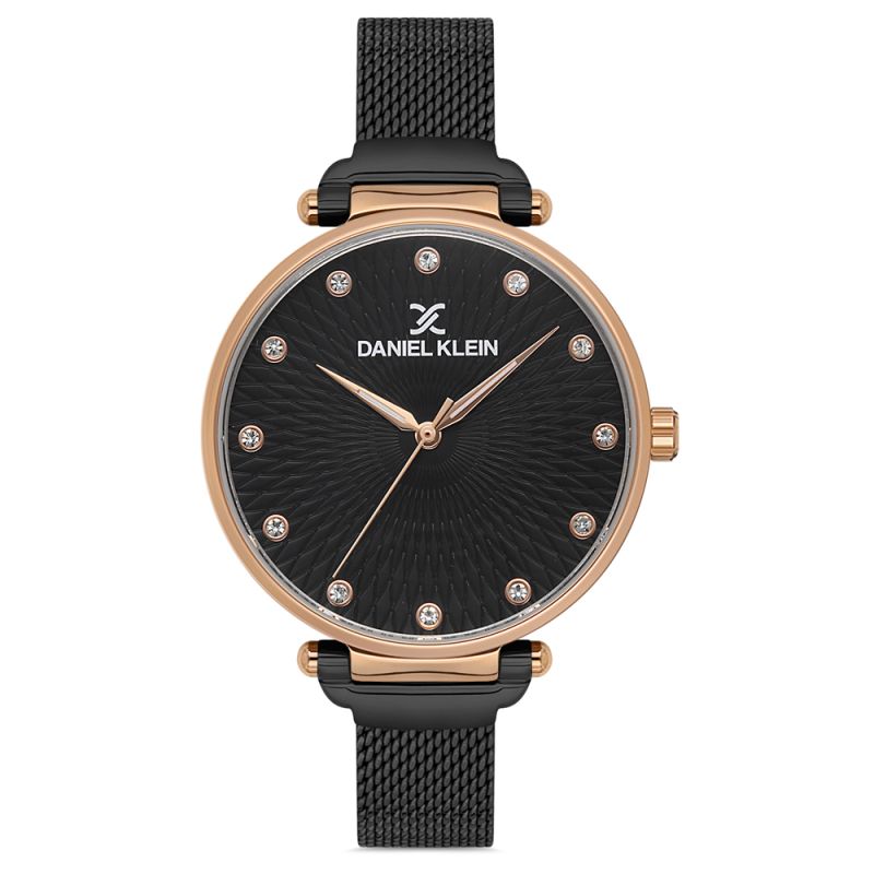 Дамски часовник Daniel Klein от колекцията Premium. Моделът е с корпус от метал и черна меш верижка от неръждаема стомана. Аналогов дисплей с минерално стъкло и декорация от инкрустирани кристали на часовите маркери. Кварцов механизъм. Водоустойчивост 3 ATM - допускат се леки пръски, не се препоръчва обилно мокрене.