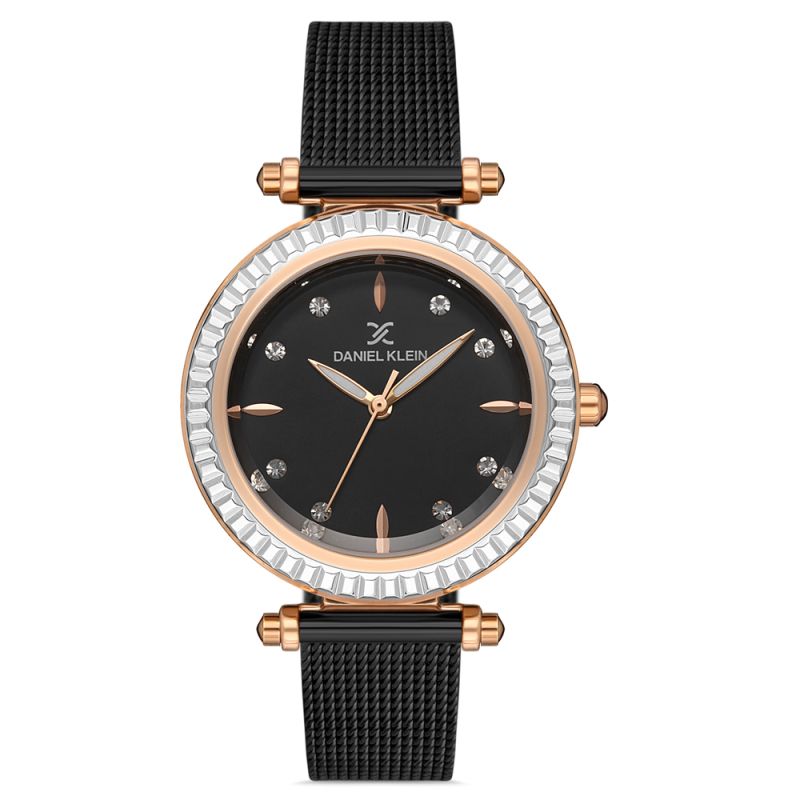 Дамски часовник Daniel Klein от колекцията Premium. Моделът е с корпус от метал и меш верижка от неръждаема стомана в черен цвят. Аналогов дисплей с минерално стъкло и декорация от инкрустирани кристали. Задвижва се от кварцов механизъм. Водоустойчивост 3 ATM - допускат се леки пръски, не се препоръчва обилно мокрене.