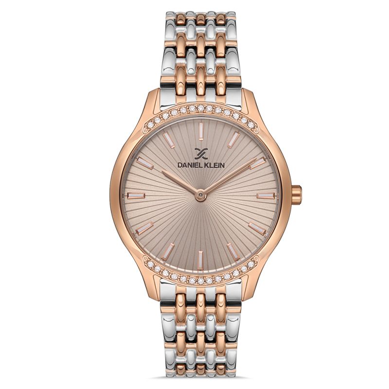 Дамски часовник Daniel Klein от колекцията Premium с модерна визия и декорация от нежни кристали. Моделът е с корпус от метал и верижка от неръждаема стомана. Аналогов дисплей с минерално стъкло. Кварцов механизъм. Водоустойчивост 3 ATM - допускат се леки пръски, не се препоръчва обилно мокрене.