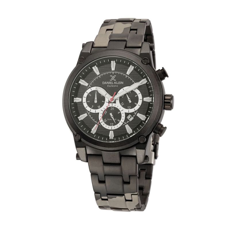 Мъжки часовник Daniel Klein от колекцията Exclusive. Корпус изработен от висококачествена метална сплав. Верижка от неръждаема стомана с камуфлажна шарка. Мултифункционален дисплей с показатели за ден, дата и двойно време. Стъкло минерал-кристал. Кварцов механизъм. Водоустойчивост 5 ATM - допускат се леки пръски и взимане на душ, не се препоръчва обилно мокрене.