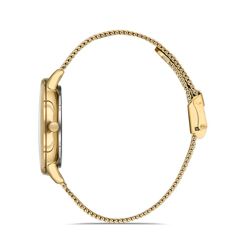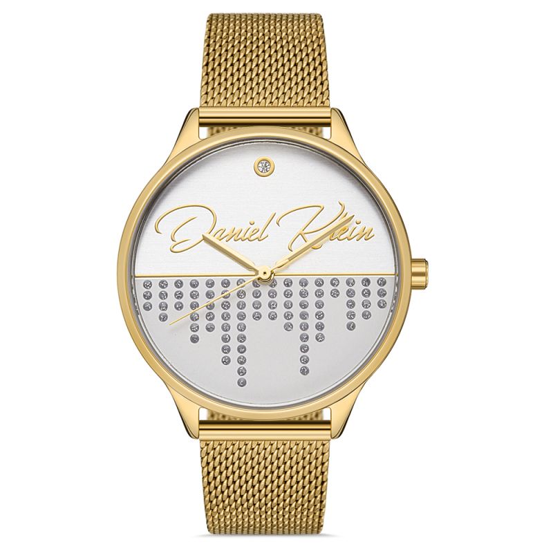 Дамски часовник Daniel Klein с модерна и интересна визия от колекция Trendy. Корпус от метал. Меш верижка от неръждаема стомана в златист цвят. Аналогов дисплей с минерално стъкло. Кварцов механизъм. Водоустойчивост 3 ATM - допускат се леки пръски, не се препоръчва обилно мокрене.