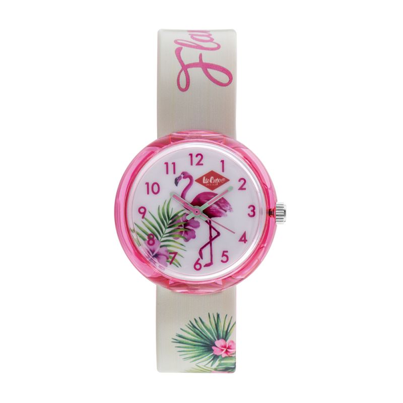 Детски часовник Lee Cooper с цветен дизайн. Аналогов дисплей с илюстрация на розово фламинго. Стъкло минерал-кристал. Корпус от поликарбонат, съчетан със силиконова каишка. Задвижва се от кварцов механизъм. Водоустойчивост 3 ATM - допускат се леки пръски, не се препоръчва обилно мокрене.