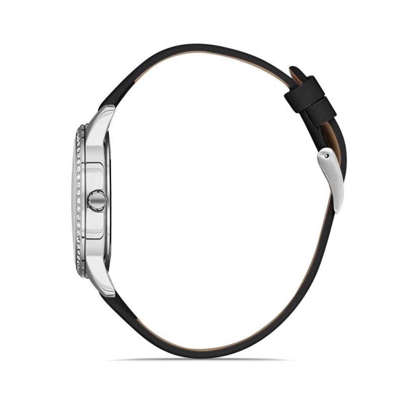 Дамски часовник Daniel Klein от колекция Premium с декорация от инкрустирани кристали по безела. Моделът е с корпус от метал и черна кожена каишка. Аналогов дисплей с минерално стъкло. Кварцов механизъм. Водоустойчивост 3 ATM - допускат се леки пръски, не се препоръчва обилно мокрене.