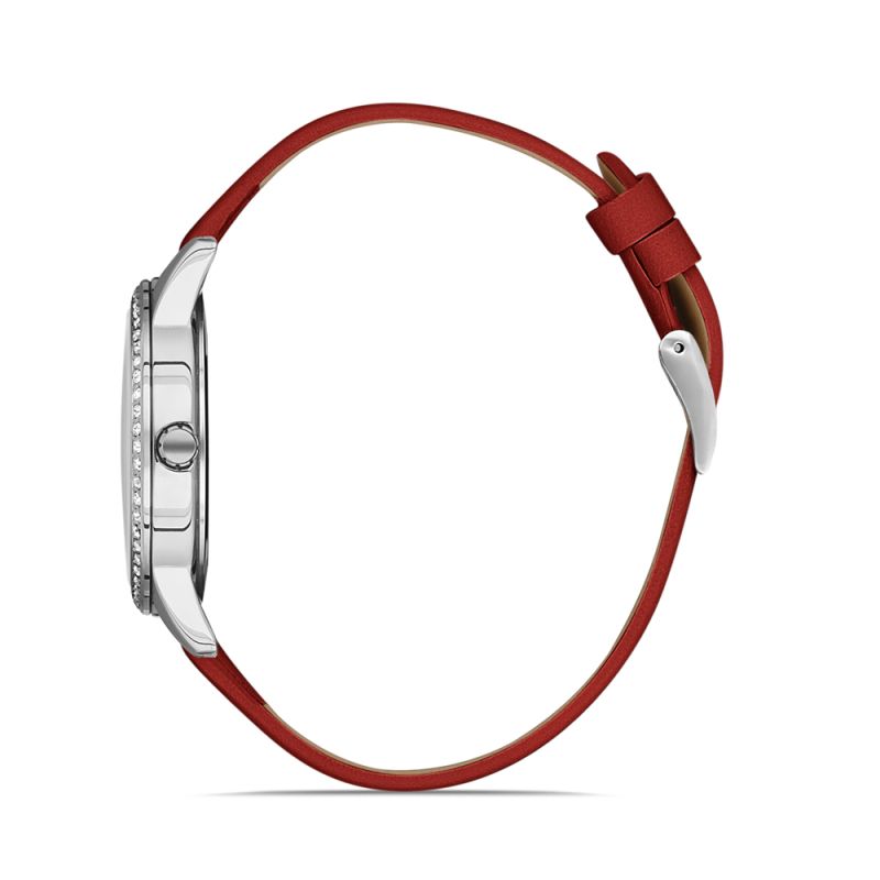 Дамски часовник Daniel Klein от колекция Premium с декорация от инкрустирани кристали по безела. Моделът е с корпус от метал и тъмночервена кожена каишка. Аналогов дисплей с минерално стъкло. Кварцов механизъм. Водоустойчивост 3 ATM - допускат се леки пръски, не се препоръчва обилно мокрене.