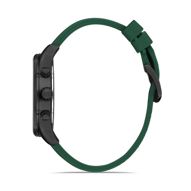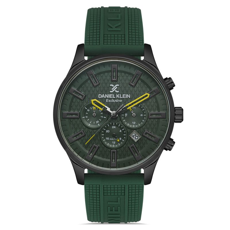 Спортен модел мъжки часовник Daniel Klein от колекцията Exclusive. Корпус от метал. Тъмнозелена силиконова каишка. Мултифункционален дисплей с показатели за дата, ден от седмицата и двойно време. Стъкло минерал-кристал. Кварцов механизъм. Водоустойчивост 5 ATM - допускат се леки пръски и взимане на душ, не се препоръчва обилно мокрене.