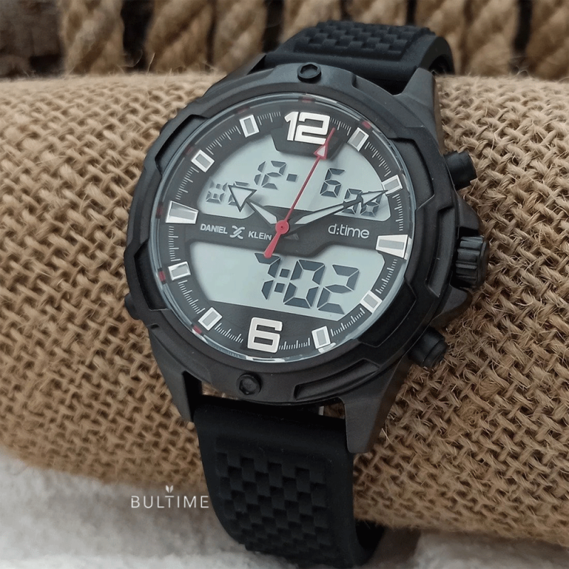 Мъжки часовник Daniel Klein от колекцията D Time. Дисплеят е комбинация от аналогов и дигитален. Стъкло минерал-кристал. Метален корпус, съчетан със силиконова каишка. Задвижва се от кварцов механизъм. Водоустойчивост на часовника 3 ATM - допускат се леки пръски, не се препоръчва обилно мокрене.