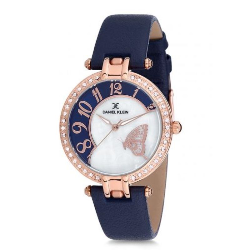 Дамски часовник Daniel Klein от колекцията Premium. Двупластов аналогов дисплей със седеф, декорация от стилизирана пеперуда и нежни кристали по ринга. Стъкло минерал-кристал. Корпус от висококачествена метална сплав. Каишка от естествена кожа. Кварцов механизъм. Водоустойчивост 3 ATM - допускат се леки пръски, не се препоръчва обилно мокрене.