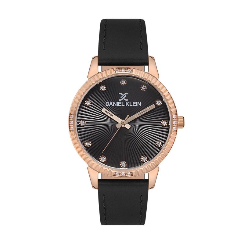 Дамски часовник Daniel Klein от колекцията Premium. Моделът е с черен аналогов дисплей и декорация от инкрустирани кристали. Стъкло минерал-кристал. Корпус изработен от висококачествена метална сплав, съчетан с каишка от естествена кожа. Кварцов механизъм. Водоустойчивост 3 ATM - допускат се леки пръски, не се препоръчва обилно мокрене.