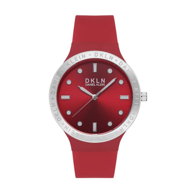 Дамски часовник Daniel Klein със спортно-ежедневна визия. Моделът е с корпус от полимер и силиконова каишка. Червен аналогов дисплей. Стъкло минерал-кристал. Задвижва се от кварцов механизъм. Водоустойчивост 3 ATM - допускат се леки пръски, не се препоръчва обилно мокрене.