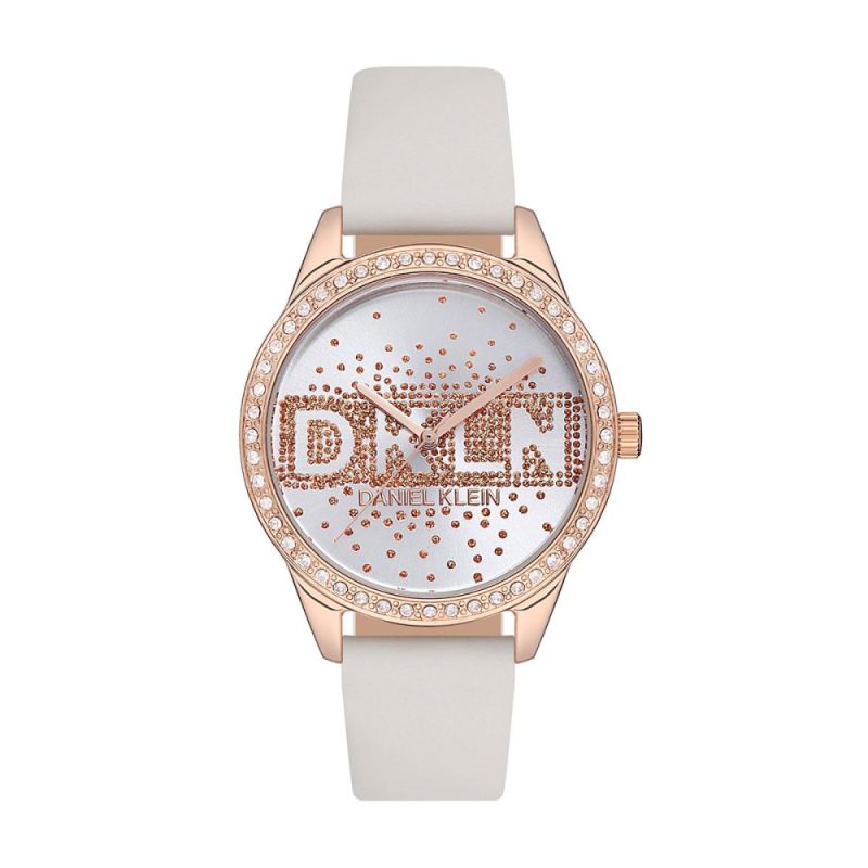 Дамски часовник Daniel Klein с декорация от бляскави кристали. Моделът е с аналогов дисплей и стъкло минерал-кристал. Метален корпус, съчетан с каишка от естествена кожа. Часовникът се задвижва от кварцов механизъм. Водоустойчивост 3 ATM - допускат се леки пръски, не се препоръчва обилно мокрене.