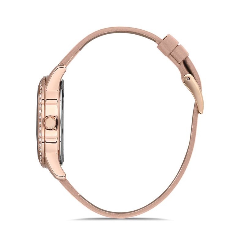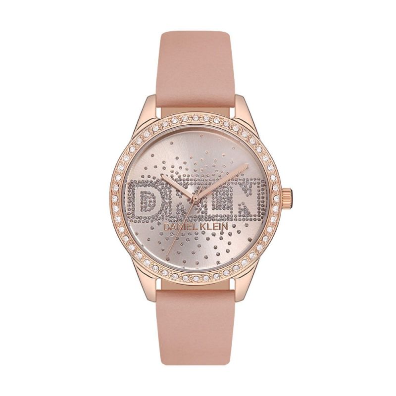 Дамски часовник Daniel Klein с декорация от бляскави кристали. Моделът е с аналогов дисплей в цвят розово злато. Стъкло минерал-кристал. Метален корпус, съчетан с каишка от естествена кожа. Часовникът се задвижва от кварцов механизъм. Водоустойчивост 3 ATM - допускат се леки пръски, не се препоръчва обилно мокрене.
