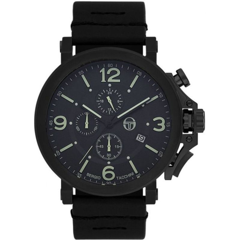 Мъжки часовник Sergio Tacchini със спортно-елегантен дизайн от колекцията Heritech Chronograph. Дисплей хронограф с точност 1/60 от минутата и максимално измервано време 30 минути. Фосфоресциращи стрелки и индекси. Минерално стъкло, устойчиво на надраскване с антирефлексно покритие. Корпус от неръждаема стомана. Каишка от естествена кожа с декоративен шев. Прецизен кварцов механизъм JS15 CITIZEN MIYOTA произведен в Япония. Водоустойчивост 10 ATM - позволява мокрене, къпане и плуване във водни басейни.