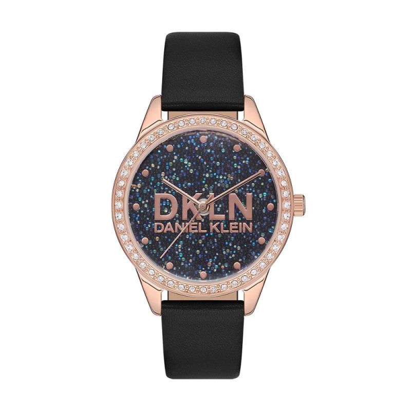 Дамски часовник Daniel Klein с интересен и модерен дизайн от колекцията Premium. Черен аналогов дисплей с цветни бляскави детайли и централно разположено лого. Декорация от инкрустирани кристали по ринга. Стъкло минерал-кристал. Метален корпус, съчетан с каишка от естествена кожа. Задвижва се от кварцов механизъм. Водоустойчивост 3 ATM - допускат се леки пръски, не се препоръчва обилно мокрене.