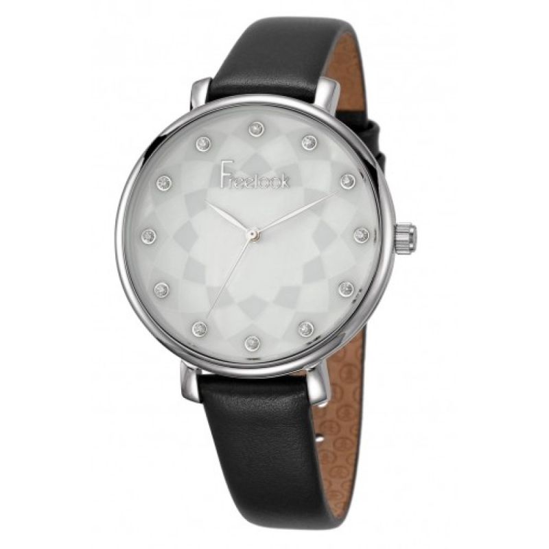 Дамски часовник Freelook от колекцията Eiffel. Моделът е с корпус от неръждаема стомана и черна кожена каишка. Стъкло минерал-кристал. Аналогов дисплей с декорация от инкрустирани кристали. Кварцов механизъм. Водоустойчивост 3 ATM - допускат се леки пръски, не се препоръчва обилно мокрене.