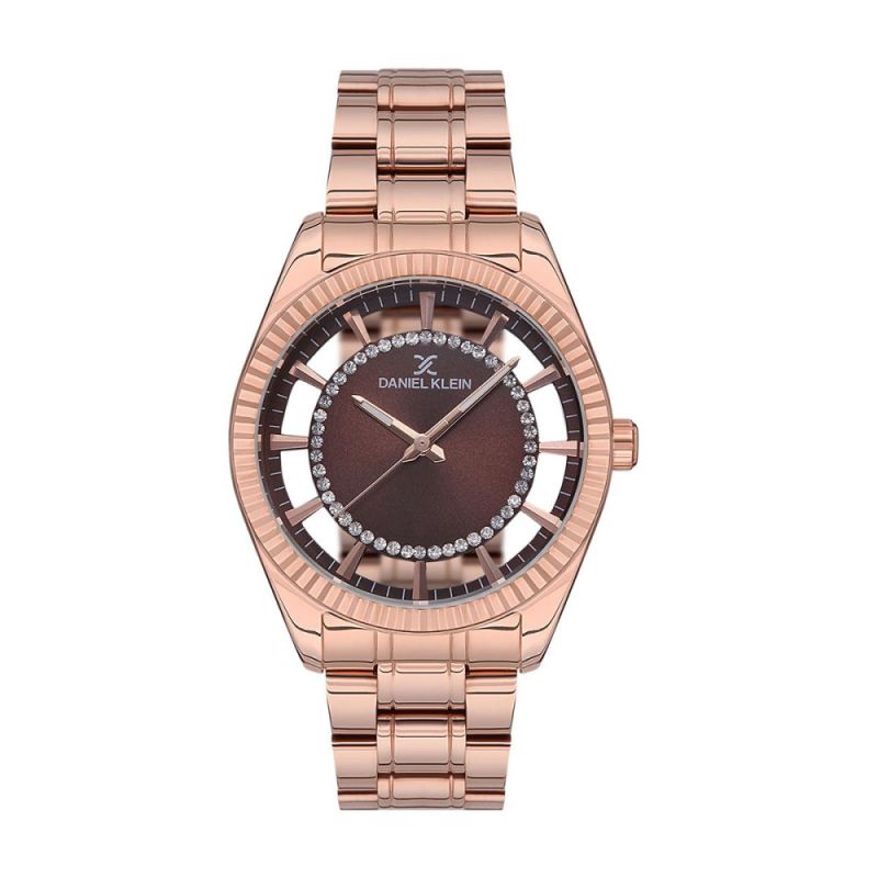 Дамски часовник Daniel Klein от колекцията Premium. Аналогов дисплей с интересен дизайн, вътрешна част в кафяв цвят с декорация от инкрустирани кристали и прозрачна външна част. Стъкло минерал-кристал. Метален корпус, съчетан с верижка от неръждаема стомана. Задвижва се от кварцов механизъм. Водоустойчивост 3 ATM - допускат се леки пръски, не се препоръчва обилно мокрене.