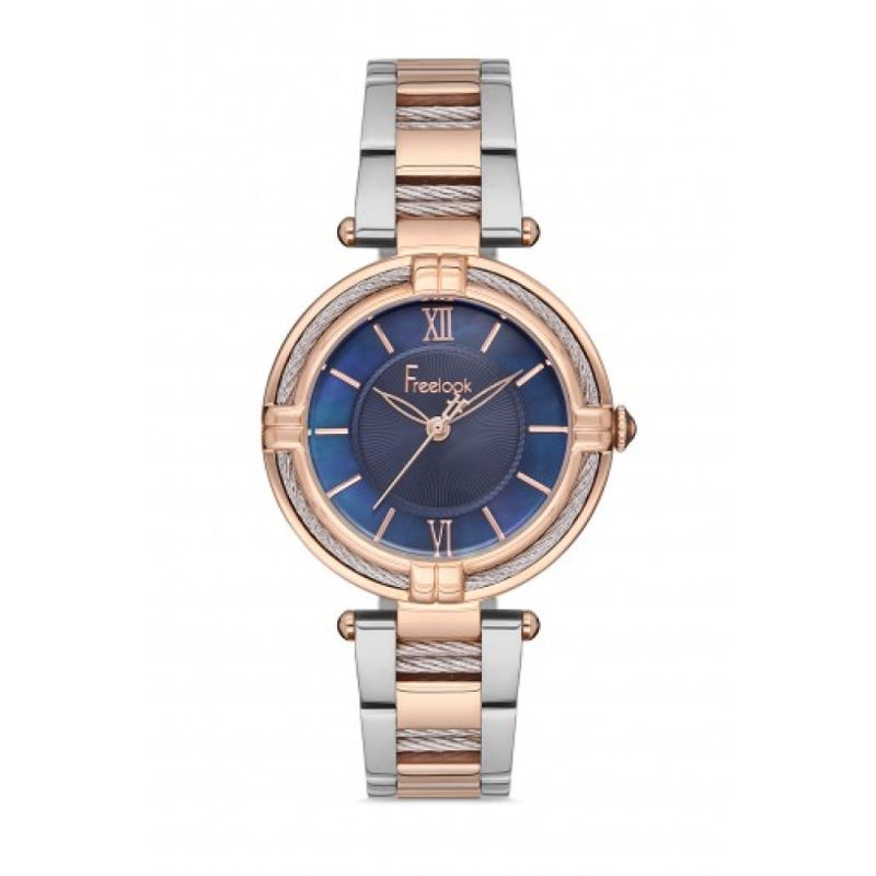 Дамски часовник Freelook с елегантна визия от серията Belle. Корпус от месинг. Стъкло минерал-кристал. Верижка от неръждаема стомана. Аналогов дисплей с външна част от седеф. Моделът е с декорация от стилизирани метални елементи във формата на кабели. Кварцов механизъм. Водоустойчивост 5 ATM - допускат се леки пръски и взимане на душ, не се препоръчва обилно мокрене.