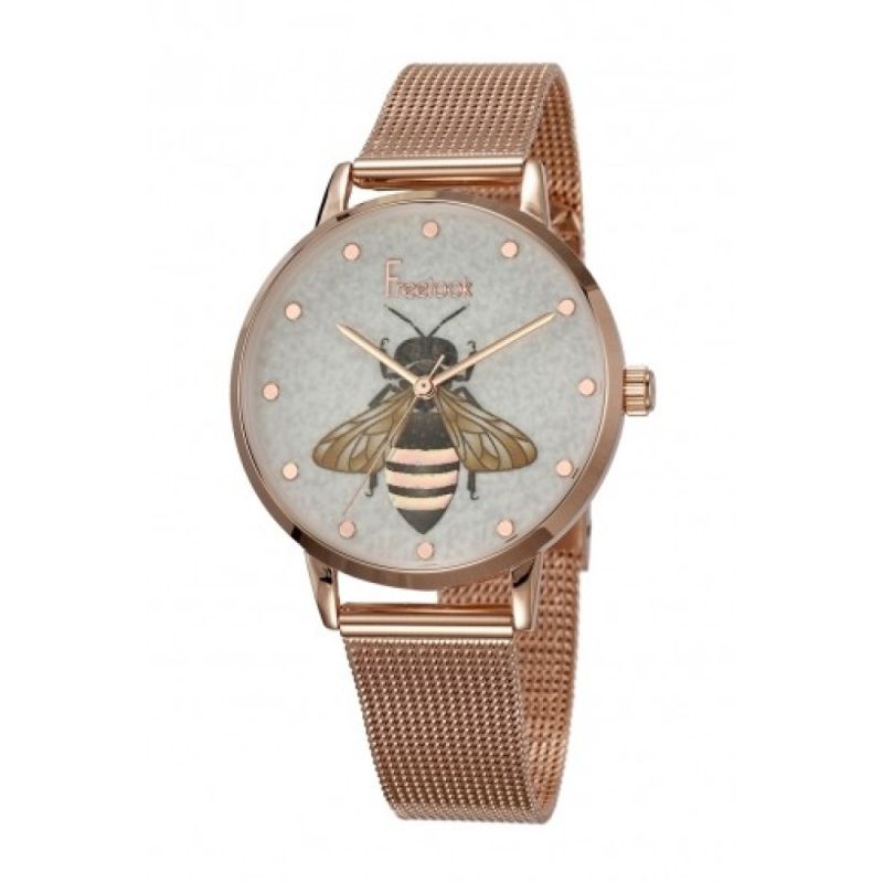 Дамски часовник Freelook от колекцията Eiffel. Моделът е с корпус и верижка ситна плетка от неръждаема стомана. Стъкло минерал-кристал. Аналогов дисплей с декорация във формата на пчела. Кварцов механизъм. Водоустойчивост 3 ATM - допускат се леки пръски, не се препоръчва обилно мокрене.