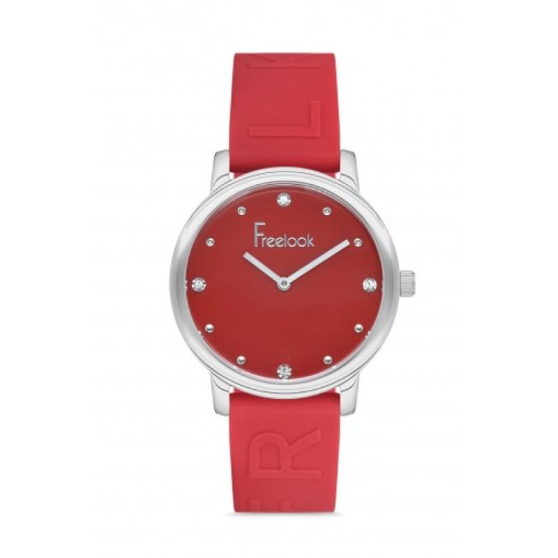 Дамски часовник Freelook с елегантна визия от серията Eiffel. Моделът е с корпус от месинг и минерално стъкло. Червена силиконова каишка с релефно лого. Аналогов дисплей с декорация от инкрустирани кристали. Кварцов механизъм. Водоустойчивост 5 ATM - допускат се леки пръски и взимане на душ, не се препоръчва обилно мокрене.