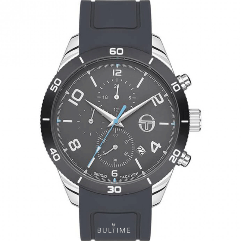 Мъжки часовник Sergio Tacchini със спортен дизайн от колекцията Archivio Chronograph. Моделът е с тъмносив дисплей хронограф. Сребристи фосфоресциращи стрелки, индекси и цифри. Корпус от неръждаема стомана, съчетан със силиконова каишка. Стъкло минерал-кристал. Прецизен кварцов механизъм произведен в Япония. Водоустойчивост 10 ATM - позволява мокрене, къпане и плуване във водни басейни.