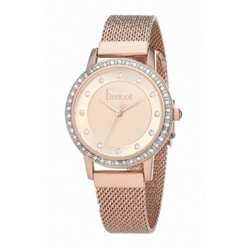 Нежен дамски часовник Freelook с декорация от инкрустирани кристали. Моделът е с корпус от метал и минерално стъкло. Верижка ситна плетка от неръждаема стомана в цвят розово злато. Аналогов дисплей. Кварцов механизъм. Водоустойчивост 3 ATM - допускат се леки пръски, не се препоръчва обилно мокрене.