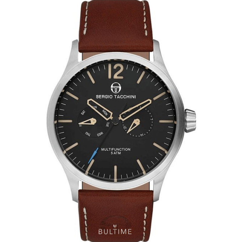 Спортно-елегантен мъжки часовник Sergio Tacchini с мултифункционален дисплей от колекциятаCity. Корпус от неръждаема стомана, съчетан с кожена каишка. Минерално стъкло, устойчиво на надраскване с антирефлексно покритие. Прецизен кварцов механизъм произведен в Япония. Водоустойчивост 5 ATM - допускат се леки пръски и взимане на душ, не се препоръчва обилно мокрене.