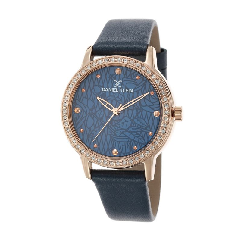 Дамски часовник Daniel Klein с модерна визия от колекцията Premium. Моделът е с аналогов дисплей с интересен флорален принт и декорация от нежни кристали по ринга. Стъкло минерал-кристал. Метален корпус, съчетан с каишка от естествена кожа. Задвижва се от кварцов механизъм. Водоустойчивост 3 ATM - допускат се леки пръски, не се препоръчва обилно мокрене.
