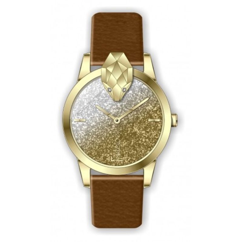 Дамски часовник Freelook от колекцията Belle с интересна визия. Моделът е с аналогов дисплей с бляскава основа и преливащ сиво-златист цвят, декорация във формата на змийска глава на ринга. Кафява каишка от естествена кожа. Метален корпус. Стъкло минерал-кристал. Кварцов механизъм. Водоустойчивост 5 ATM - допускат се леки пръски и взимане на душ, не се препоръчва обилно мокрене.