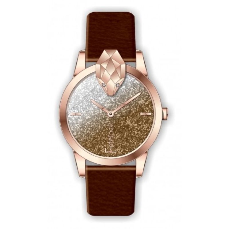 Дамски часовник Freelook от колекцията Belle с интересна визия. Моделът е с аналогов дисплей с бляскава основа и преливащ сиво-розово златист цвят, декорация във формата на змийска глава на ринга. Кафява каишка от естествена кожа. Метален корпус. Стъкло минерал-кристал. Кварцов механизъм. Водоустойчивост 5 ATM - допускат се леки пръски и взимане на душ, не се препоръчва обилно мокрене.