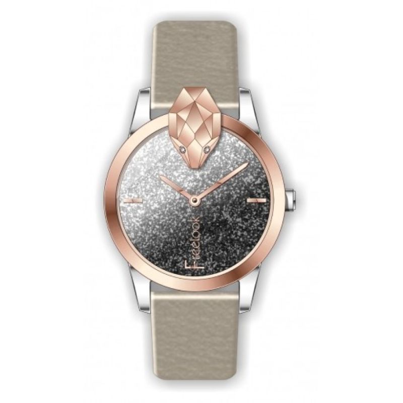 Дамски часовник Freelook от колекцията Belle с интересна визия. Моделът е с аналогов дисплей с бляскава основа и преливащ сиво-черен цвят, декорация под формата на змийска глава на ринга. Каишка от естествена кожа в бежов цвят. Метален корпус. Стъкло минерал-кристал. Кварцов механизъм. Водоустойчивост 5 ATM - допускат се леки пръски и взимане на душ, не се препоръчва обилно мокрене.