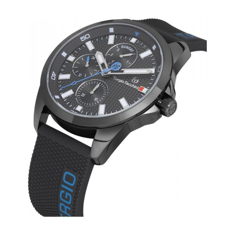 Спортен модел мъжки часовник Sergio Tacchini с мултифункционален дисплей. Корпус от неръждаема стомана в комбинация със силиконова каишка. Луминисцентно покритие на стрелките и индексите. Минерално стъкло, устойчиво на надраскване. Кварцов механизъм. Водоустойчивост 5 ATM - допускат се леки пръски и взимане на душ, не се препоръчва обилно мокрене.