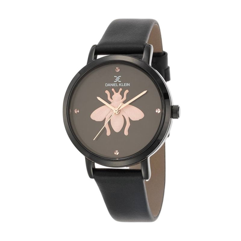 Дамски часовник Daniel Klein с модерна визия от колекцията Trendy. Аналогов дисплей със стилизирана пчела в центъра. Стъкло минерал-кристал. Метален корпус, съчетан с кожена каишка. Кварцов механизъм. Водоустойчивост 3 ATM - допускат се леки пръски, не се препоръчва обилно мокрене.