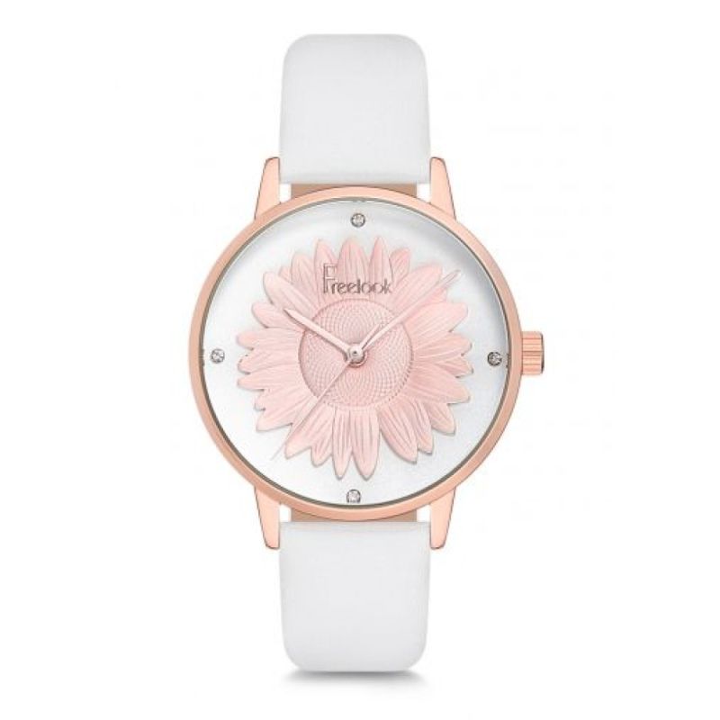 Дамски часовник Freelook с модерен и красив дизайн от колекцията Fashion. Моделът е с корпус от неръждаема стомана и каишка от естествена кожа. Стъкло минерал-кристал. Аналогов дисплей с релефно цвете в средата и декорация от инкрустирани кристали. Кварцов механизъм. Водоустойчивост 3 ATM - допускат се леки пръски, не се препоръчва обилно мокрене.