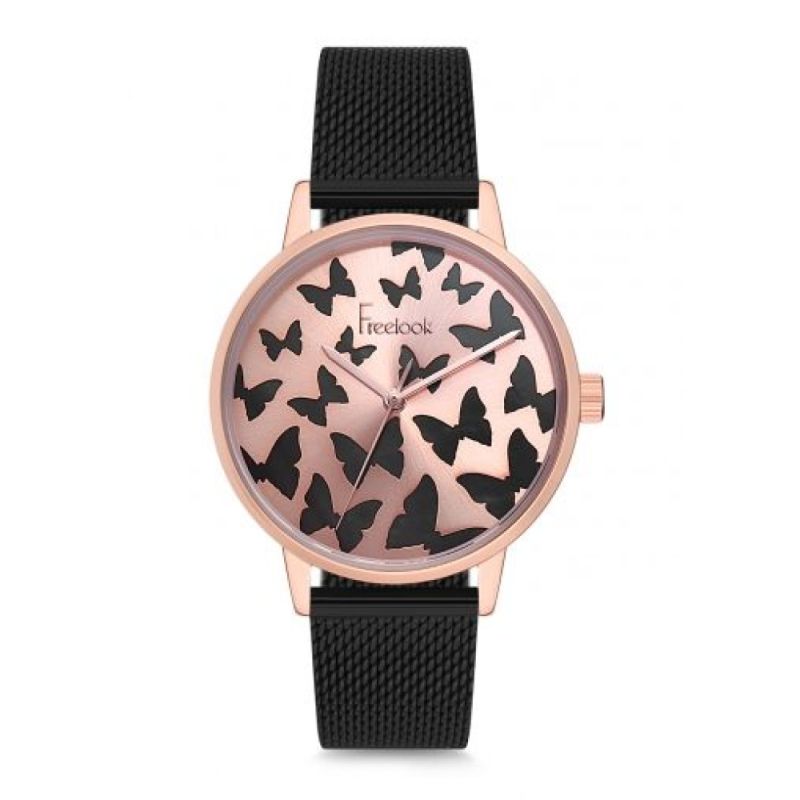 Дамски часовник Freelook с нежен и интересен дизайн от колекцията Eiffel. Моделът е с корпус и верижка ситна плетка от неръждаема стомана. Стъкло минерал-кристал. Аналогов седефен дисплей с декорация от пеперуди. Кварцов механизъм. Водоустойчивост 3 ATM - допускат се леки пръски, не се препоръчва обилно мокрене.