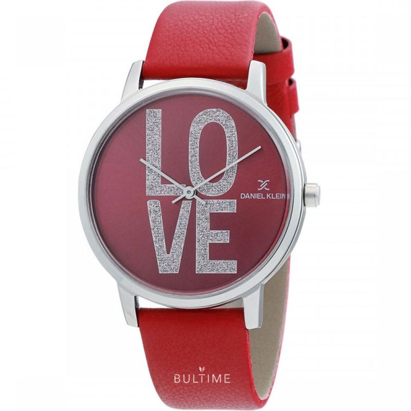 Дамски часовник Daniel Klein от колекцията Trendy. Моделът е с аналогов дисплей с бляскав надпис LOVE. Стъкло минерал-кристал. Корпус изработен от висококачествена метална сплав. Каишка от естествена кожа. Задвижва се от кварцов механизъм. Водоустойчивост 3 ATM - допускат се леки пръски, не се препоръчва обилно мокрене.