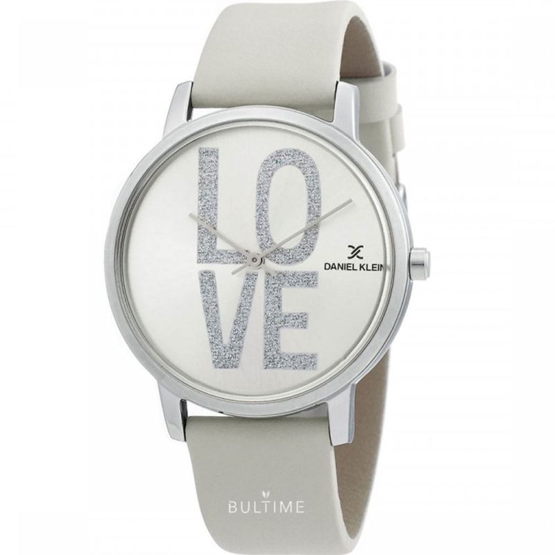Дамски часовник Daniel Klein от колекцията Trendy. Моделът е с аналогов дисплей с бляскав надпис LOVE. Стъкло минерал-кристал. Корпус изработен от висококачествена метална сплав. Каишка от естествена кожа. Задвижва се от кварцов механизъм. Водоустойчивост 3 ATM - допускат се леки пръски, не се препоръчва обилно мокрене.