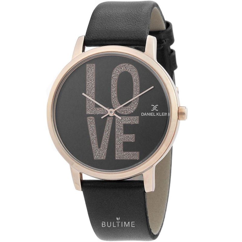 Дамски часовник Daniel Klein от колекцията Trendy. Моделът е с аналогов дисплей с бляскав надпис LOVE. Стъкло минерал-кристал. Корпус изработен от висококачествена метална сплав. Каишка от естествена кожа. Задвижва се от кварцов механизъм. Водоустойчивост 3 ATM - допускат се леки пръски, не се препоръчва обилно мокрене.