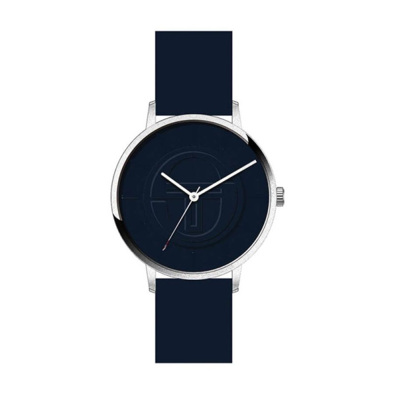 Спортно-елегантен мъжки часовник Sergio Tacchini от колекцията City. Корпус от неръждаема стомана, съчетан със силиконова каишка. Тъмносин аналогов дисплей. Стъкло минерал-кристал. Задвижва се от кварцов механизъм. Водоустойчивост 5 ATM - допускат се леки пръски и взимане на душ, не се препоръчва обилно мокрене.