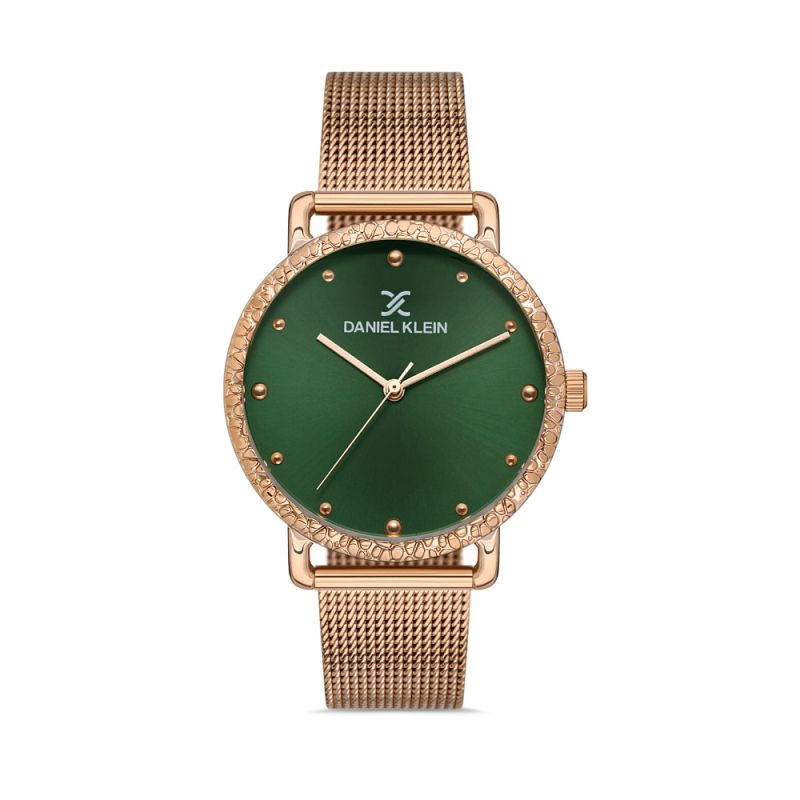 Елегантен дамски часовник Daniel Klein с изчистен дизайн от колекцията Premium. Тъмнозелен аналогов дисплей с детайли в цвят розово злато. Стъкло минерал-кристал. Корпус изработен от метал в комбинация с меш верижка от неръждаема стомана. Задвижва се от кварцов механизъм. Водоустойчивост 3 ATM - допускат се леки пръски, не се препоръчва обилно мокрене.
