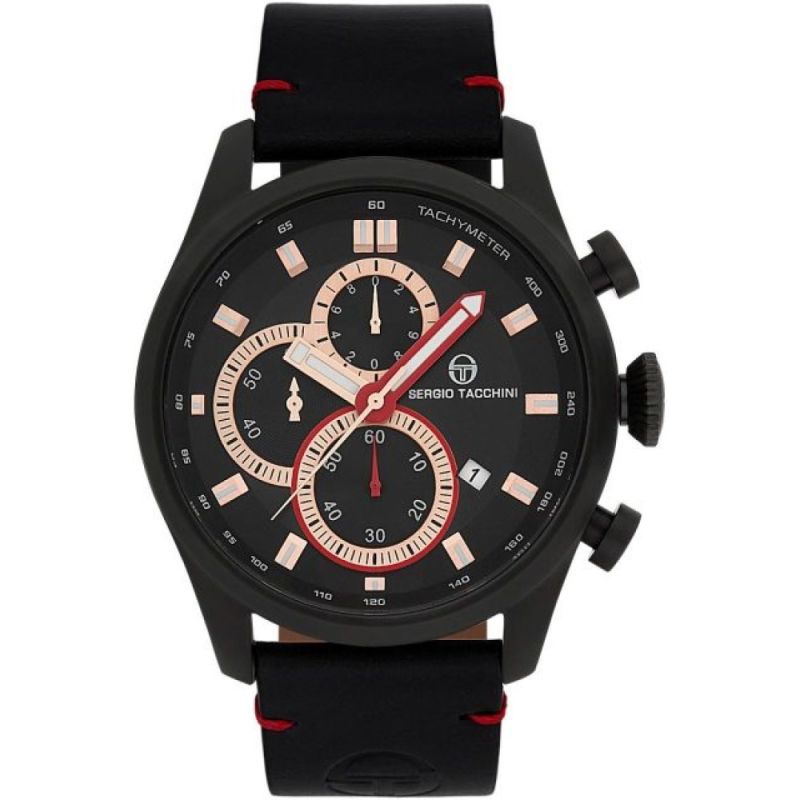 Мъжки часовник Sergio Tacchini  със спортно-елегантен дизайн от колекцията Archivio Chronograph. Моделът е с дисплей хронограф (точност 1/10 от секундата и максимално измервано време 60 минути). Фосфоресцентно покритие на стрелките и индексите. Минерално стъкло, устойчиво на надраскване. Корпус от неръждаема стомана, съчетан с каишка от естествена кожа. Прецизен кварцов механизъм VD57 SEIKO HATTORI произведен в Япония. Водоустойчивост 5 ATM - допускат се леки пръски и взимане на душ, не се препоръчва обилно мокрене.