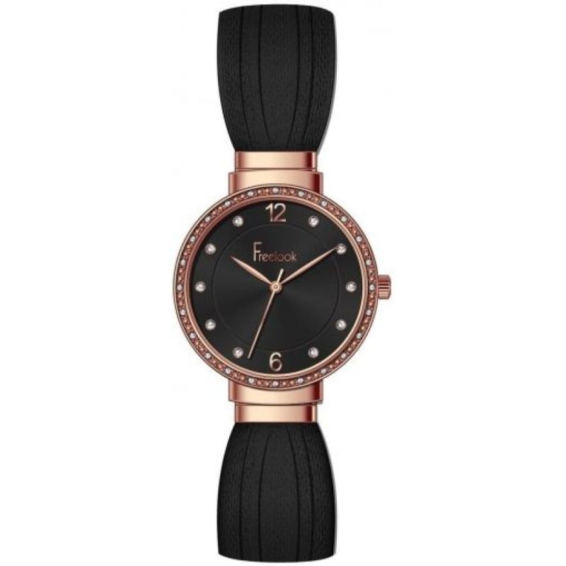 Стилен дамски часовник Freelook от колекцията Belle. Корпус и верижка от неръждаема стомана. Стъкло минерал-кристал. Черен аналогов дисплей с декорация от нежни инкрустирани кристали и розово-златисти стрелки и цифри. Кварцов механизъм.