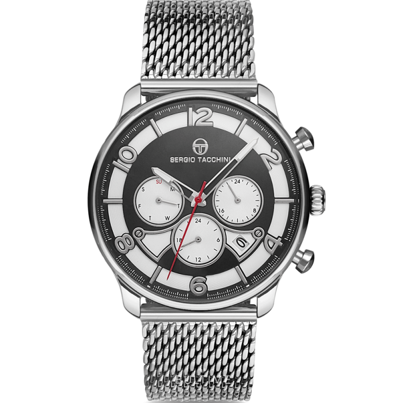 Мъжки часовник Sergio Tacchini със спортно-елегантна визия от колекцията Archivio Dual Time. Моделът е с мултифункционален дисплей с показатели за дата, ден и двойно време. Стъкло минерал-кристал с антирефлексно покритие. Корпус и верижка ситна плетка изработени от неръждаема стамана. Задвижва се от кварцов механизъм.  Водоустойчивост 5 ATM - допускат се леки пръски и взимане на душ, не се препоръчва обилно мокрене.