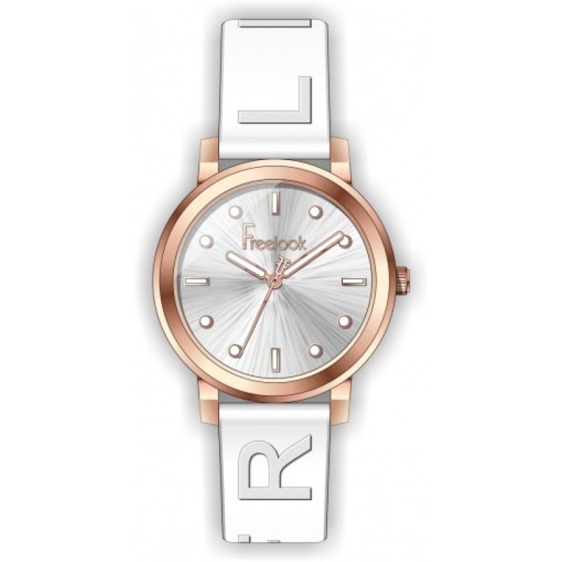 Дамски часовник Freelook от колекцията Eiffel. Моделът е с метален корпус и има минерално стъкло. Бяла силиконова каишка с принт логото на марката. Аналогов дисплей. Кварцов механизъм. Водоустойчивост 5 ATM - допускат се леки пръски и взимане на душ, не се препоръчва обилно мокрене.