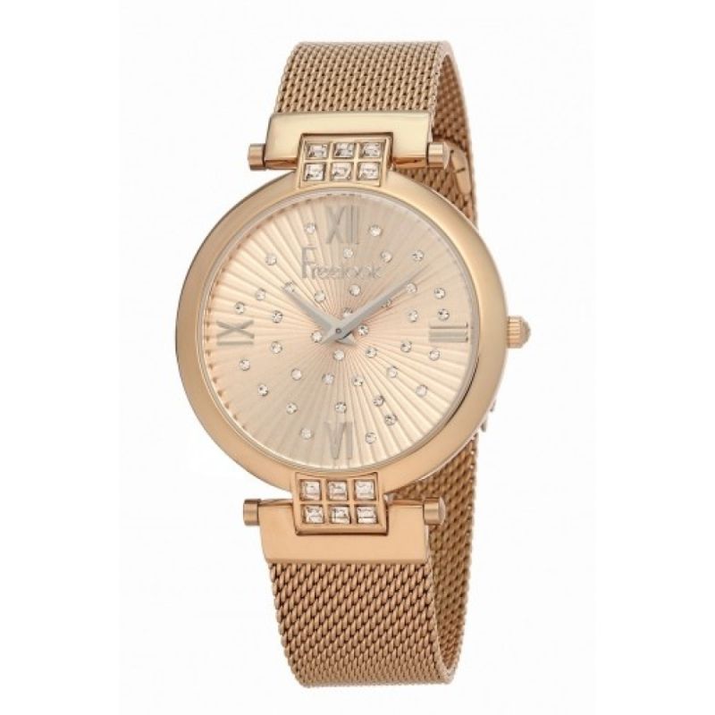 Дамски часовник Freelook от колекцията Belle с нежна и елегантна визия. Моделът е с корпус от метал и верижка с тънка плетка от неръждаема стомана. Дисплеят е аналогов с минерално стъкло и декорация от разпръснати кристали. Задвижва се от кварцов механизъм. Водоустойчивост 5 ATM - допускат се леки пръски и взимане на душ, не се препоръчва обилно мокрене.