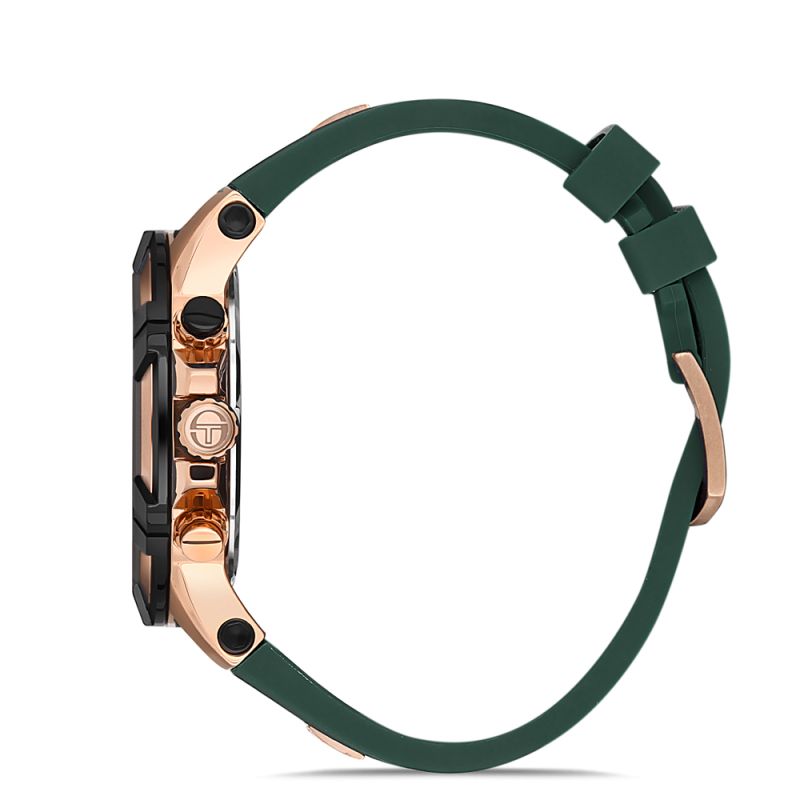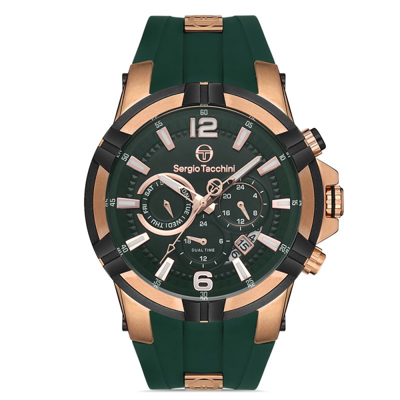 Спортно-елегантен модел мъжки часовник Sergio Tacchini от колекцията Heritech. Корпус изработен от неръждаема стомана. Зелена силиконова каишка. Мултифункционален дисплей с минерално стъкло и показатели за дата, ден от седмицата и двойно време. Кварцов механизъм. Водоустойчивост 5 ATM - допускат се леки пръски и взимане на душ, не се препоръчва обилно мокрене.