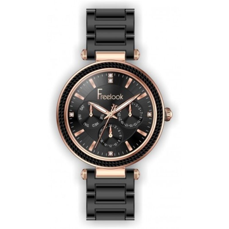 Дамски часовник Freelook с мултифункционален дисплей от колекцията Designer Basics. Моделът е с корпус от висококачествен метал. Верижка от неръждаема стомана в черен цвят. Стъкло минерал-кристал. Кварцов механизъм. Водоустойчивост 5 ATM - допускат се леки пръски и взимане на душ, не се препоръчва обилно мокрене.