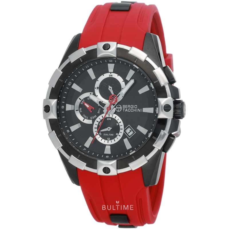 Спортен мъжки часовник Sergio Tacchini от колекцията Heritech. Корпус от неръждаема стомана. Червена силиконова каишка с метални елементи. Черен мултифункционален дисплей с показател за дата, ден и двойно време. Стъкло минерал-кристал. Кварцов механизъм. Водоустойчивост 5 ATM - допускат се леки пръски и взимане на душ, не се препоръчва обилно мокрене.